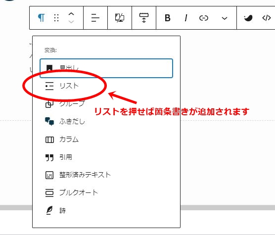 箇条書きにしたい単語をシフト+エンターで改行し、メニューバーの一番左をクリックします。
