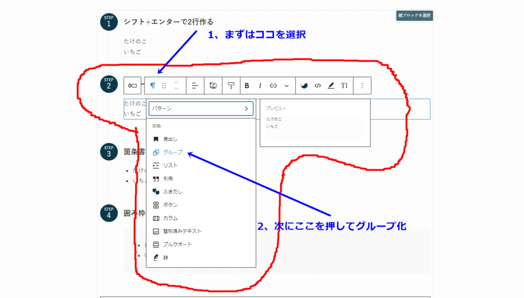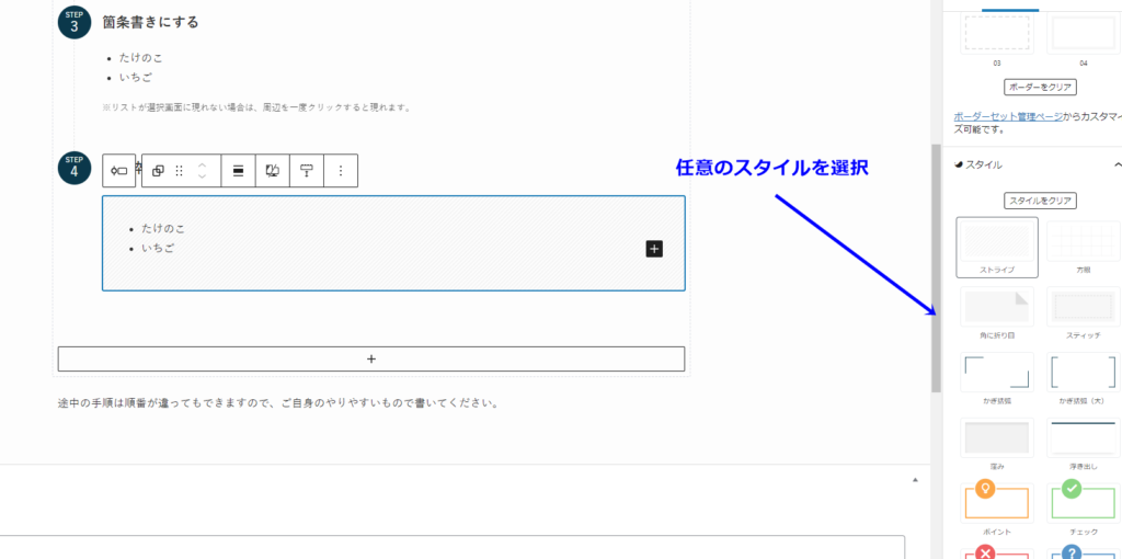 どこかをクリックしてしまって、スタイル選択ができなくなった場合は「Ctrl+Z」でやり直すか、囲みたいブロックの右上周辺をクリックすると再びスタイルを選択できるようになります。