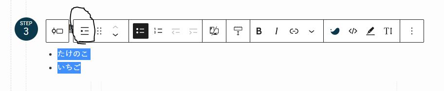 上記のマークがない場合、このマークをクリックでも箇条書きにできます。