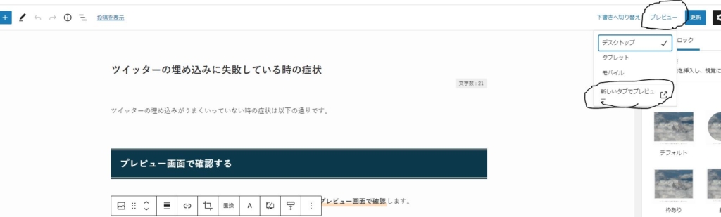 ツイッターがうまく埋め込まれているかの確認は、編集画面でなく、プレビュー画面で確認します。